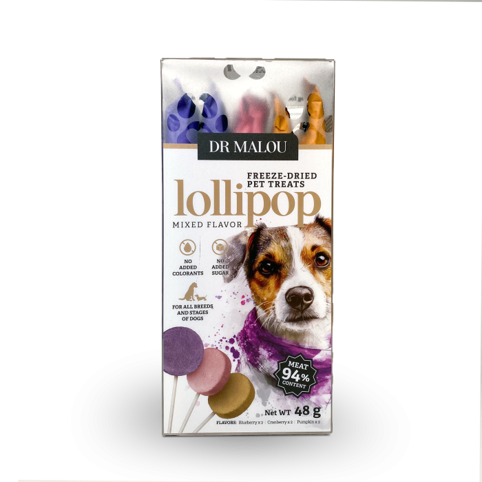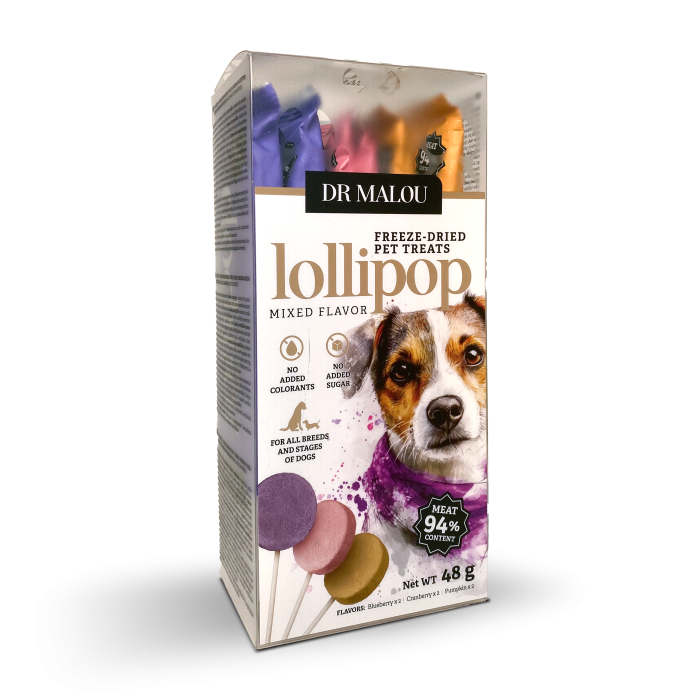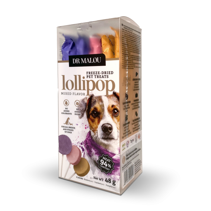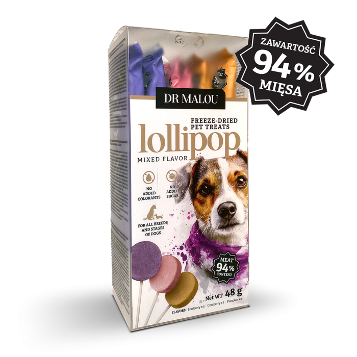 Skład lizaka z dodatkiem żurawiny: mrożone mięso kurczaka 84%, mrożona wątróbka z kurczaka 10%, suszona żurawina 2,5%, proszek ignamowy 3%, celuloza 0,5%