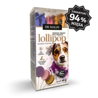Skład lizaka z dodatkiem dyni: mrożone mięso kurczaka 84%, mrożona wątróbka z kurczaka 10%, suszona dynia 2,5%, proszek ignamowy 3%, celuloza 0,5%