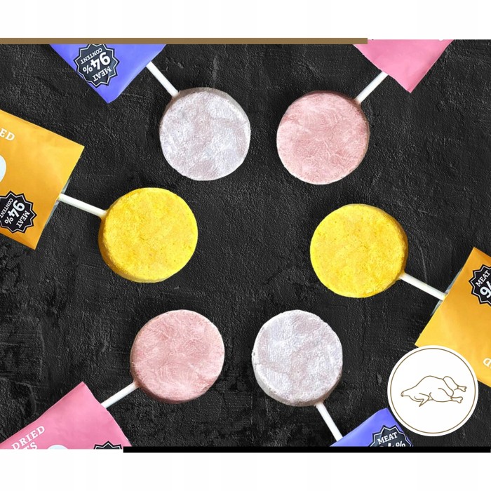 Skład lizaka z dodatkiem jagody: mrożone mięso kurczaka 84%, mrożona wątróbka z kurczaka 10%, suszona jagoda 2,5%, proszek ignamowy 3%, celuloza 0,5%