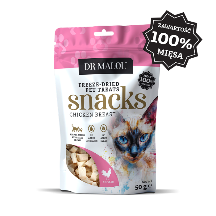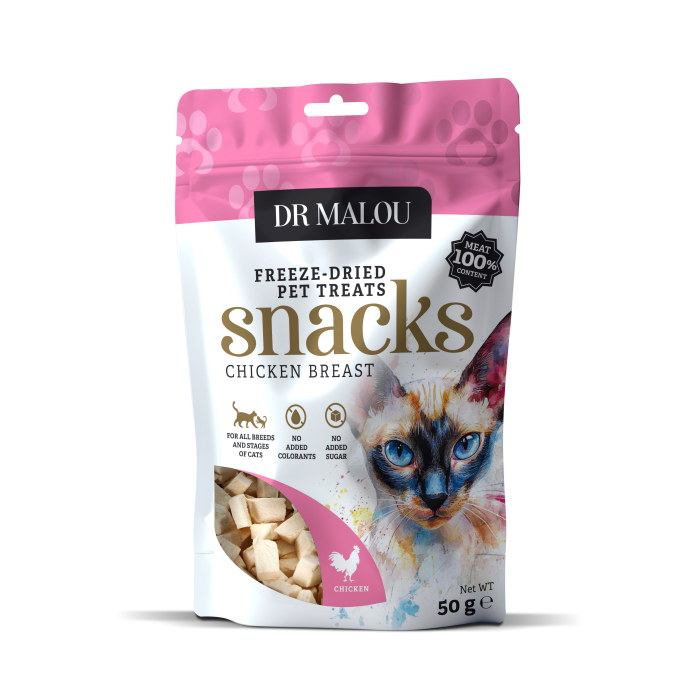 Przysmaki dla kotów Dr Malou w postaci liofilizowanych kostek z piersi kurczaka to połączenie najwyższej jakości mięsa i innowacyjnego procesu suszenia, który zachowuje maksimum wartości odżywczych.