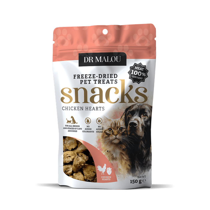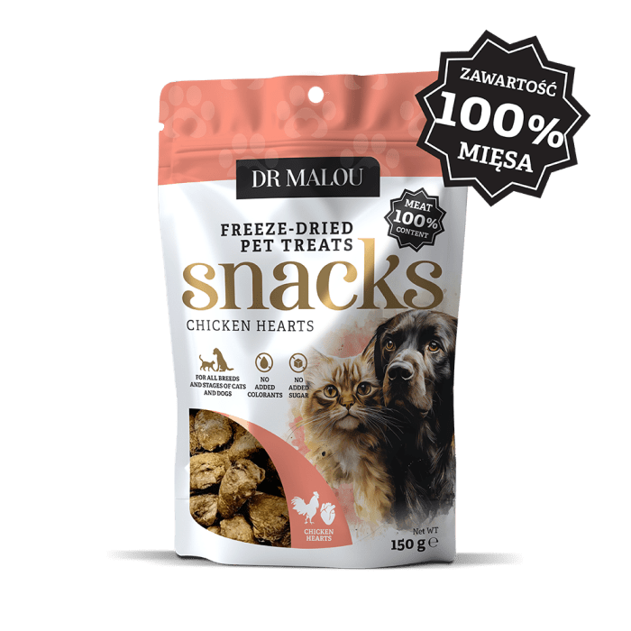 Dr Malou 100% Serca z Kurczaka — liofilizowana karma uzupełniająca dla psów i kotów to czyste źródło zdrowia: naturalny, wysokobiałkowy przysmak przygotowany w 100% z serc kurczaka. Każdy kawałek (przeznaczony dla psa i kot...